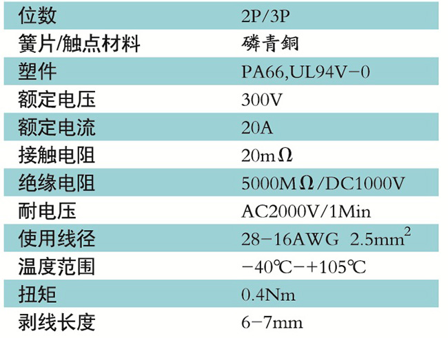 接線端子的絕緣材料用改性的尼龍(PA66),能達到或超過IEC947-7-1及EN60947-7-1標準,阻燃等級達到UL94,V-0具有良好的電氣性能和機械性能。螺絲用高強度的鋼制成鍍鋅或鎳處理,導電體四方針用合金銅制成表面鍍錫,壓片采用彈性及極強的磷青銅表面鍍錫或鎳;壓線框用抗應力裂縫腐蝕的合金銅制成,這些金屬表面還鍍錫或鍍鎳加以保護。設計完全符合IEC60947-7-1.GB14048.7等標準。
